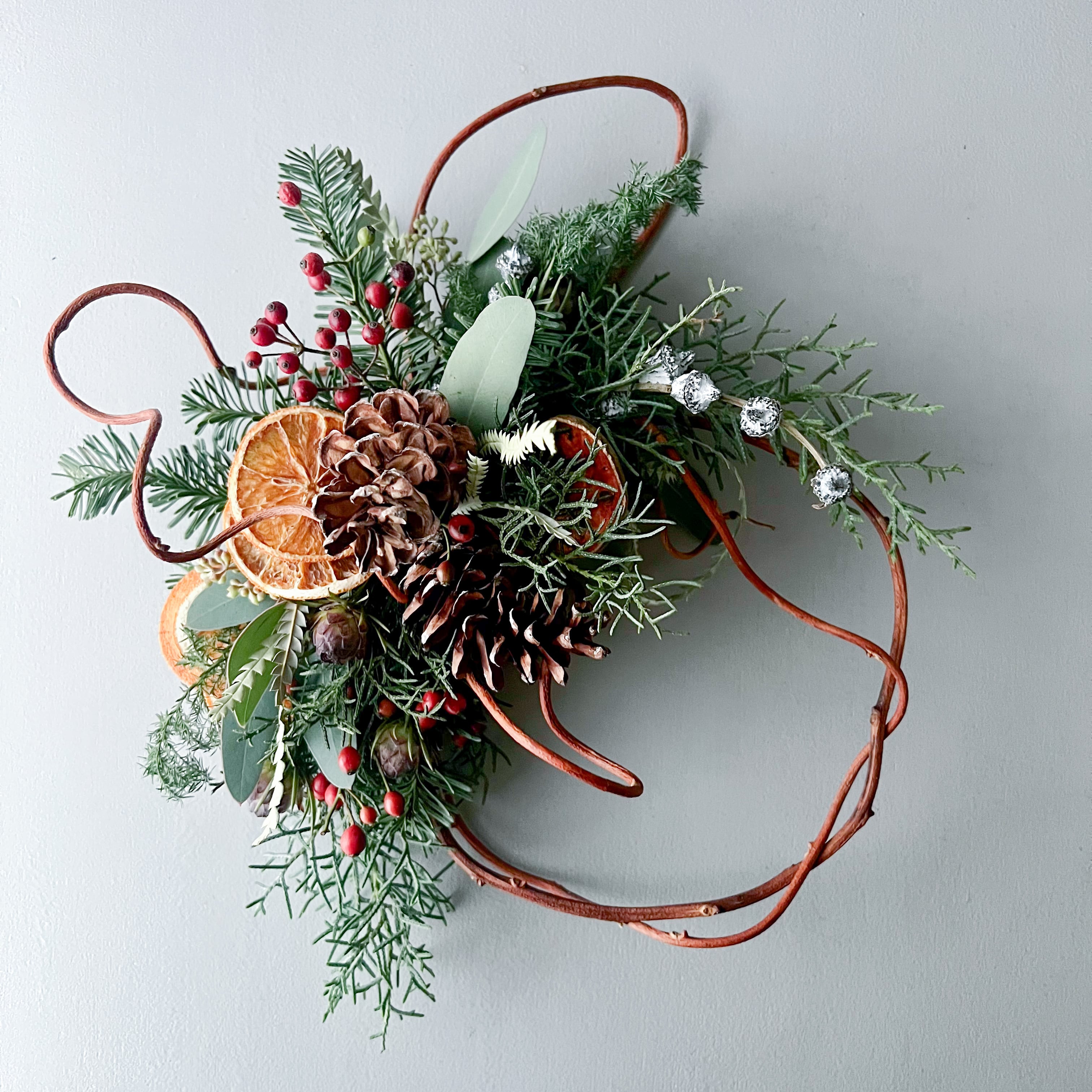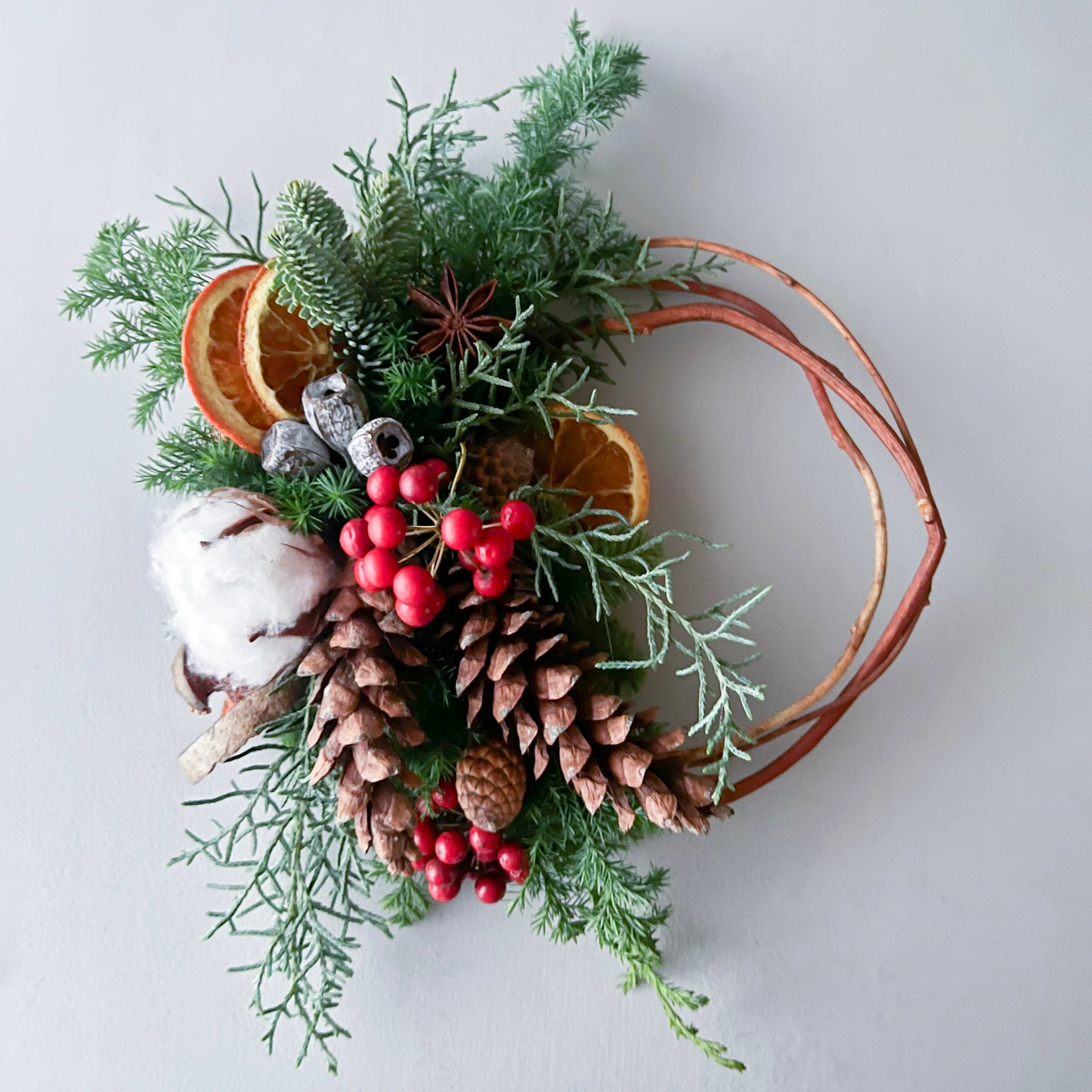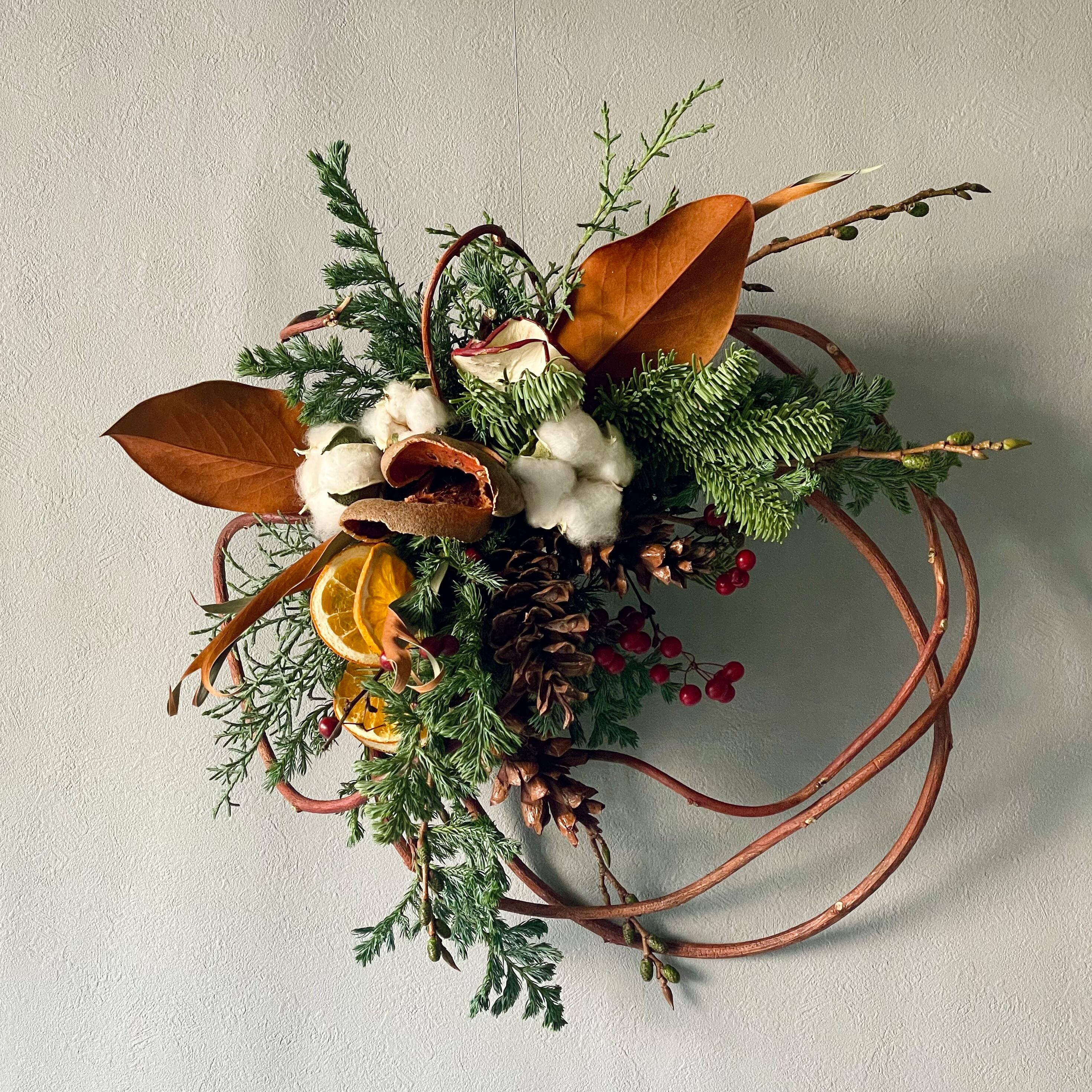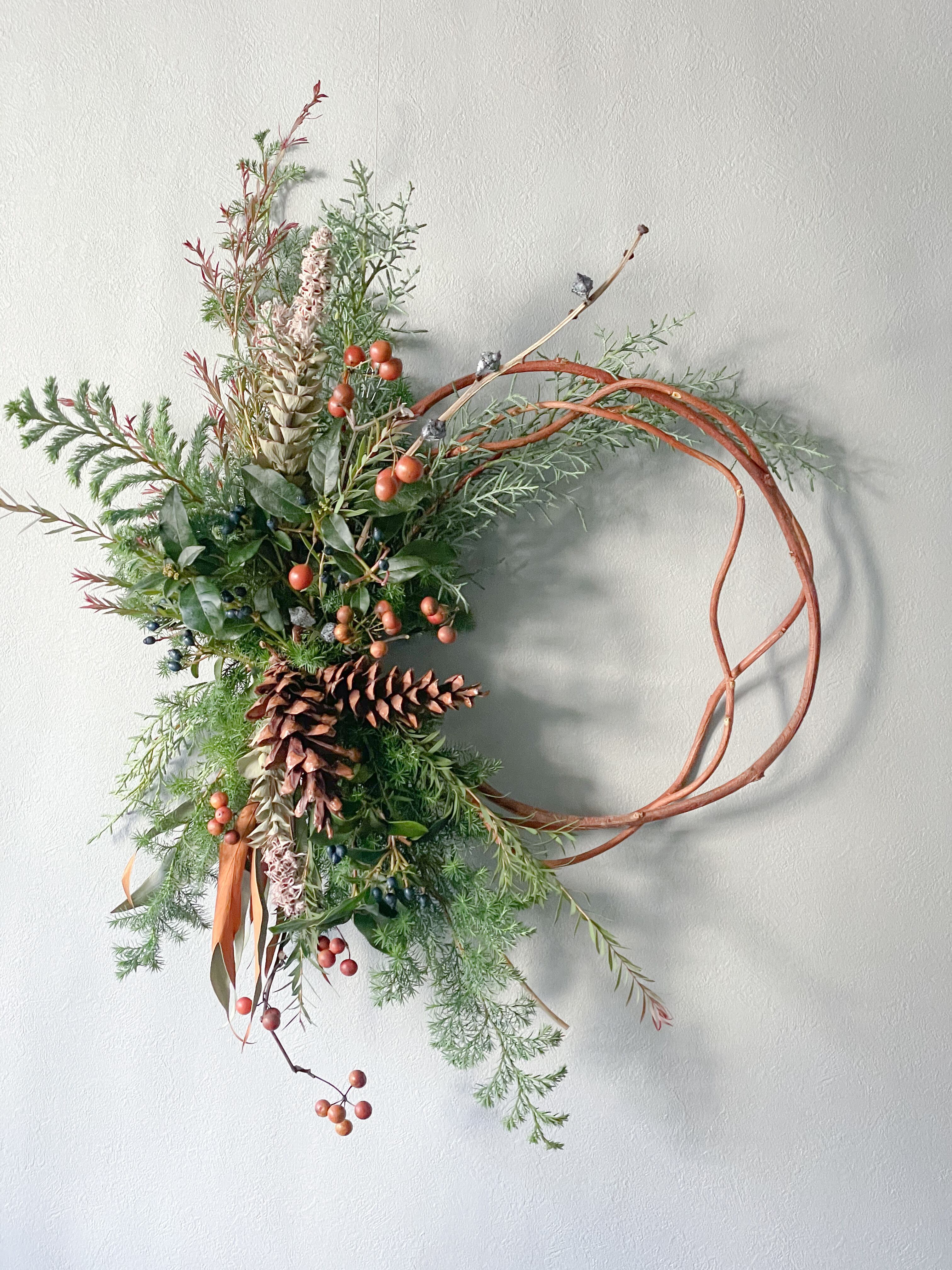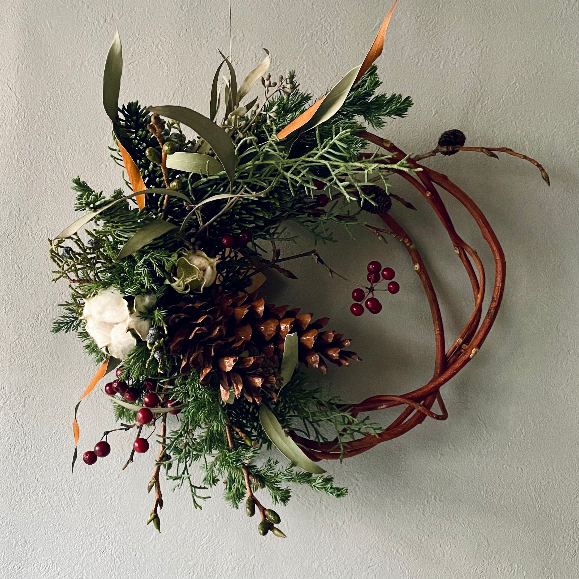 赤づるを丸めたリースベースに、ざっくりと針葉樹や木の実の束を飾ります。