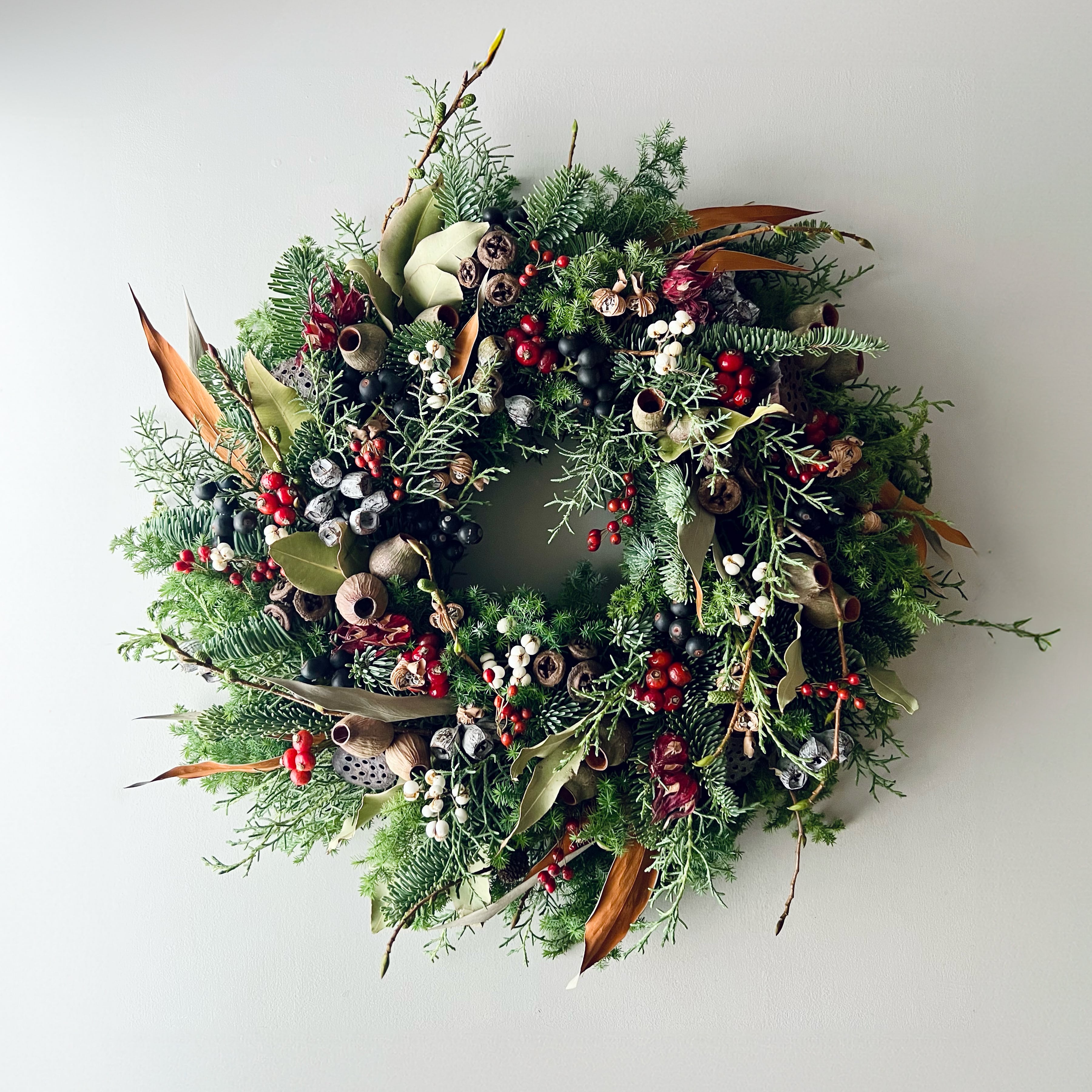 クリスマスにぴったりの、真っ赤なベリー(ローズヒップやサンキライなど)や、さまざまなユーカリのナッツがたっぷりの賑やかなリース。